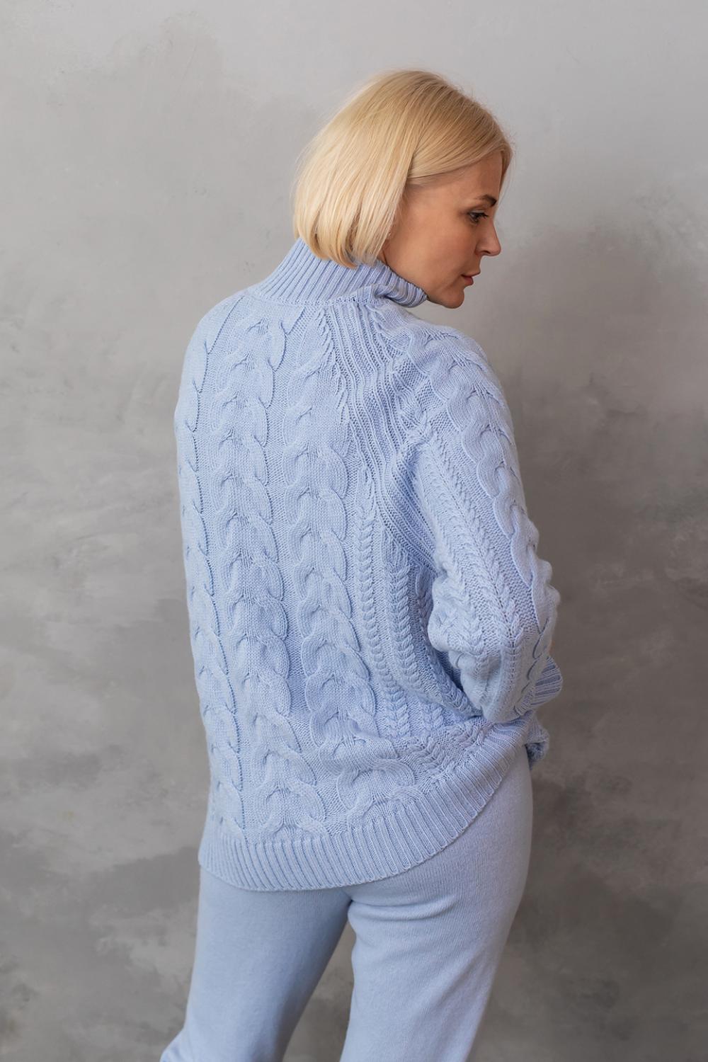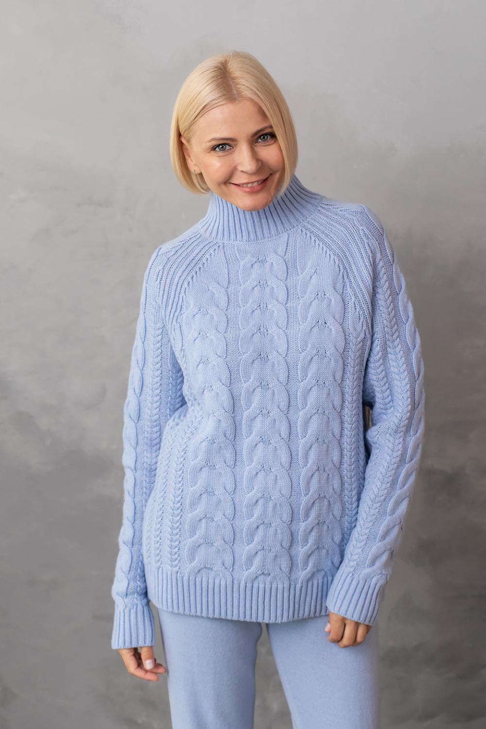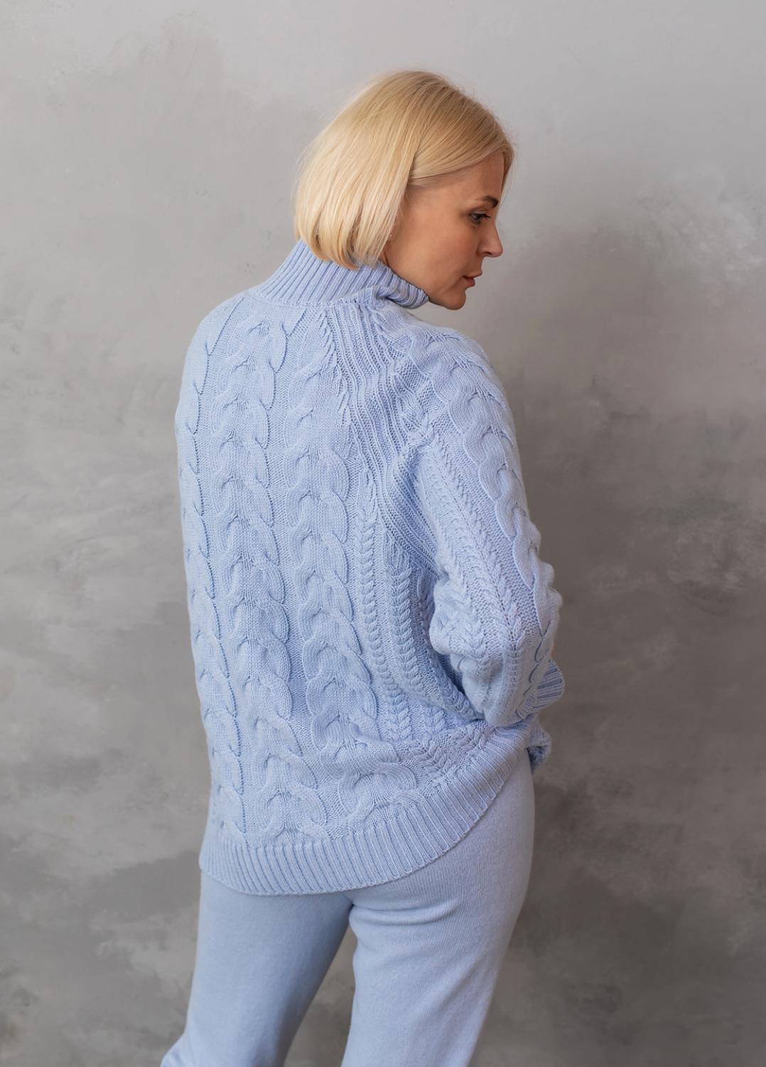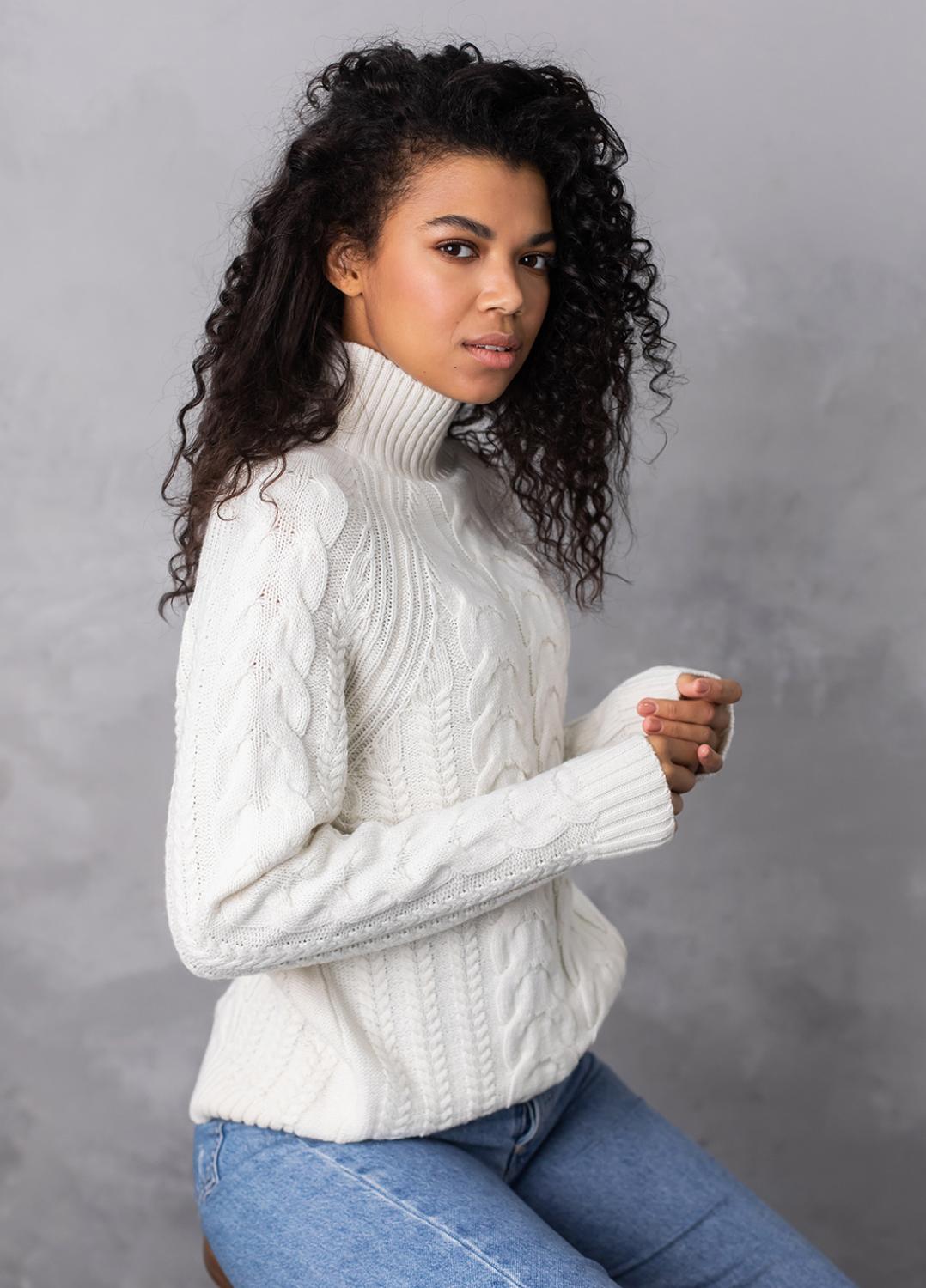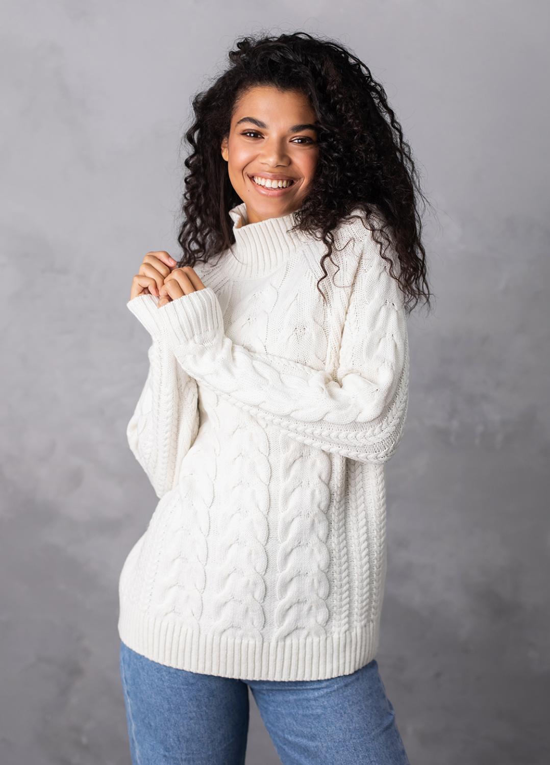 Светр з фактурним об'ємним узором «коси» забезпечує комфорт і дуже приємне відчуття впевненості в холодну погоду. Ця модель виконана з м'якої, легкої та приємної на дотик пряжі, яка добре утримує тепло, а зміст поліакрилових волокон в складі виробу робить догляд за ним більш легким та допомагає зберегти форму і насичений колір светра після прання.