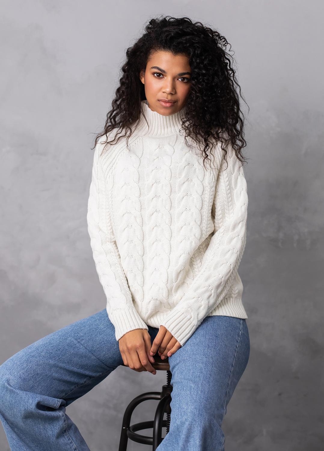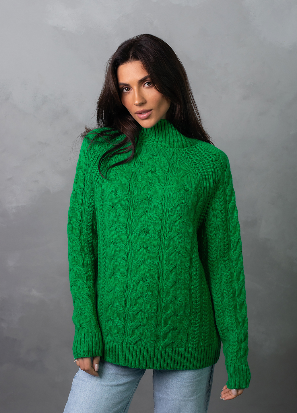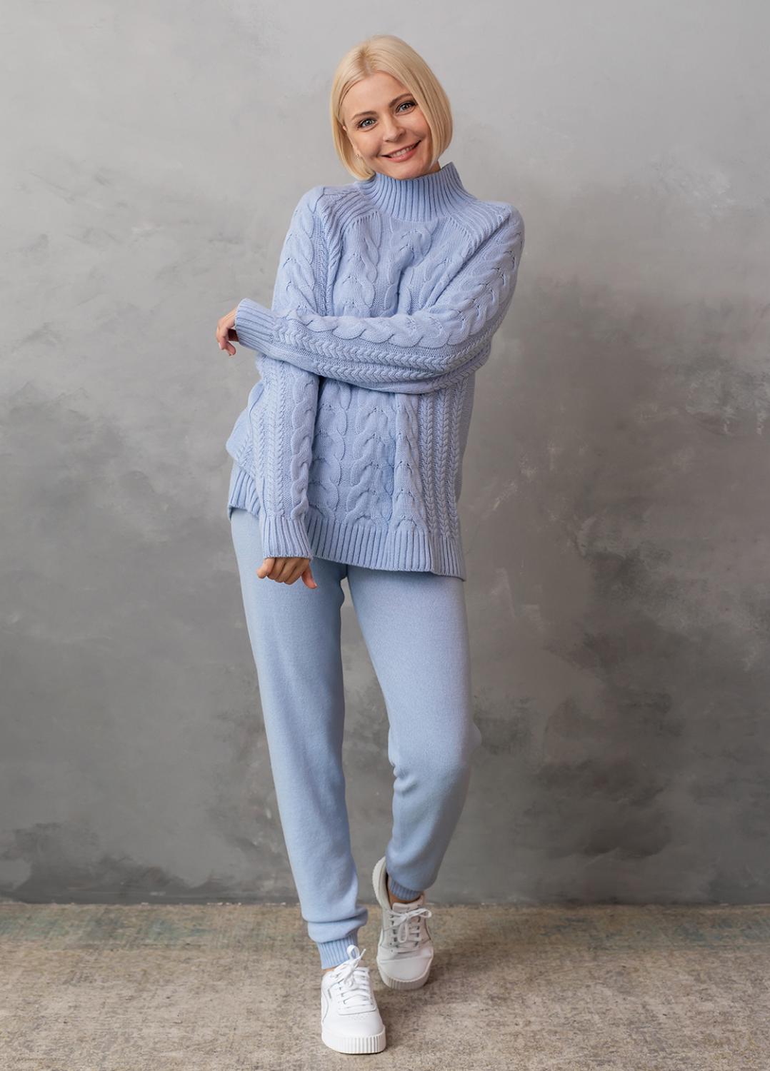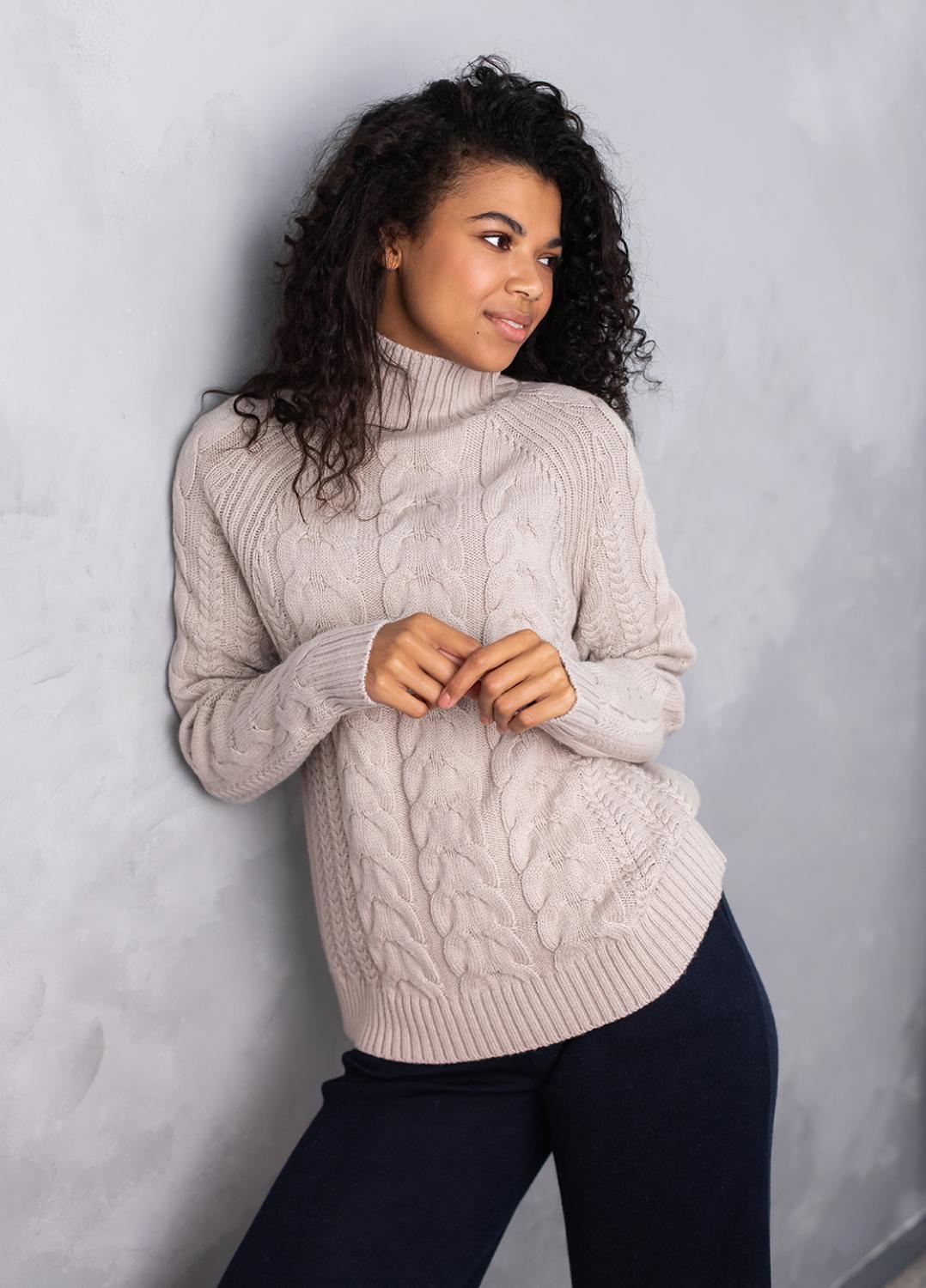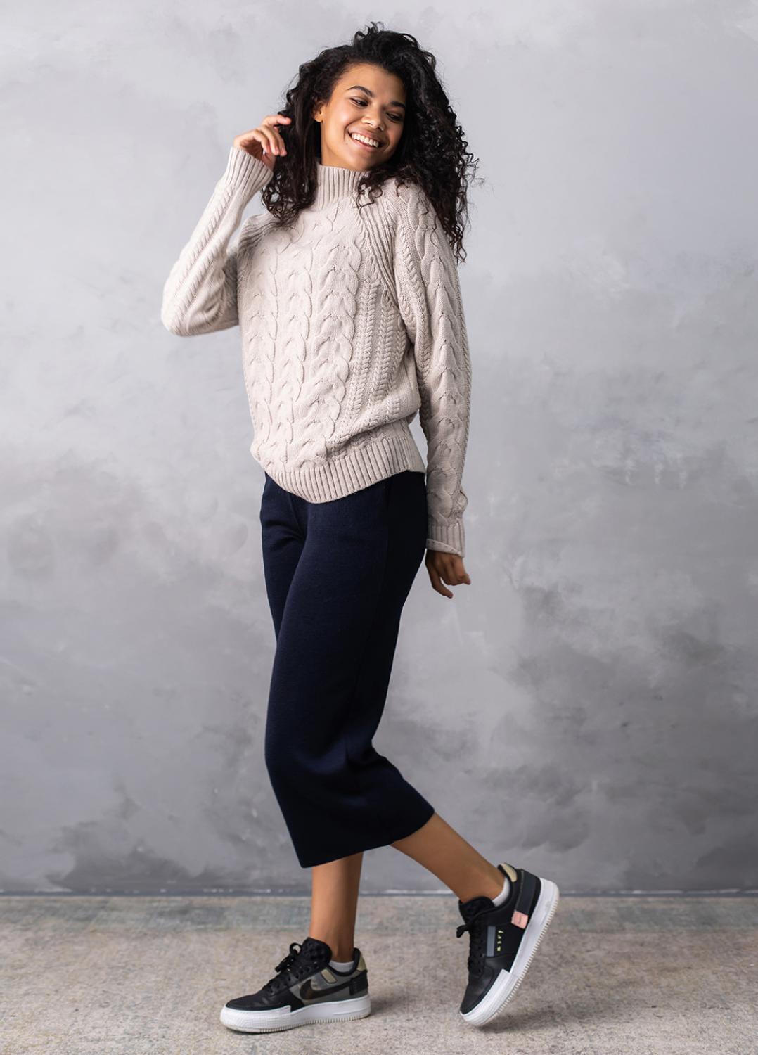 Светр з фактурним об'ємним узором «коси» забезпечує комфорт і дуже приємне відчуття впевненості в холодну погоду. Ця модель виконана з м'якої, легкої та приємної на дотик пряжі, яка добре утримує тепло, а зміст поліакрилових волокон в складі виробу робить догляд за ним більш легким та допомагає зберегти форму і насичений колір светра після прання.