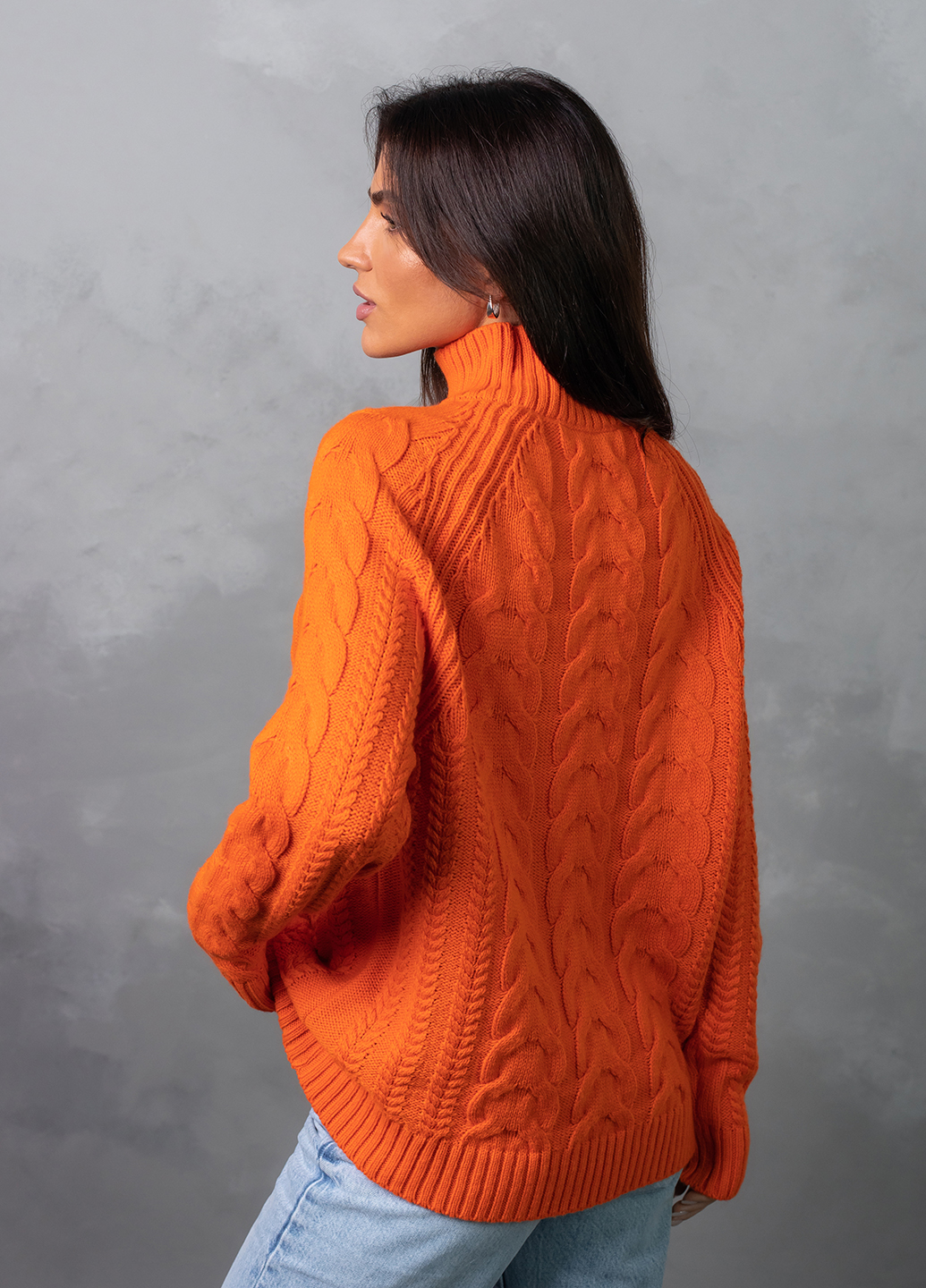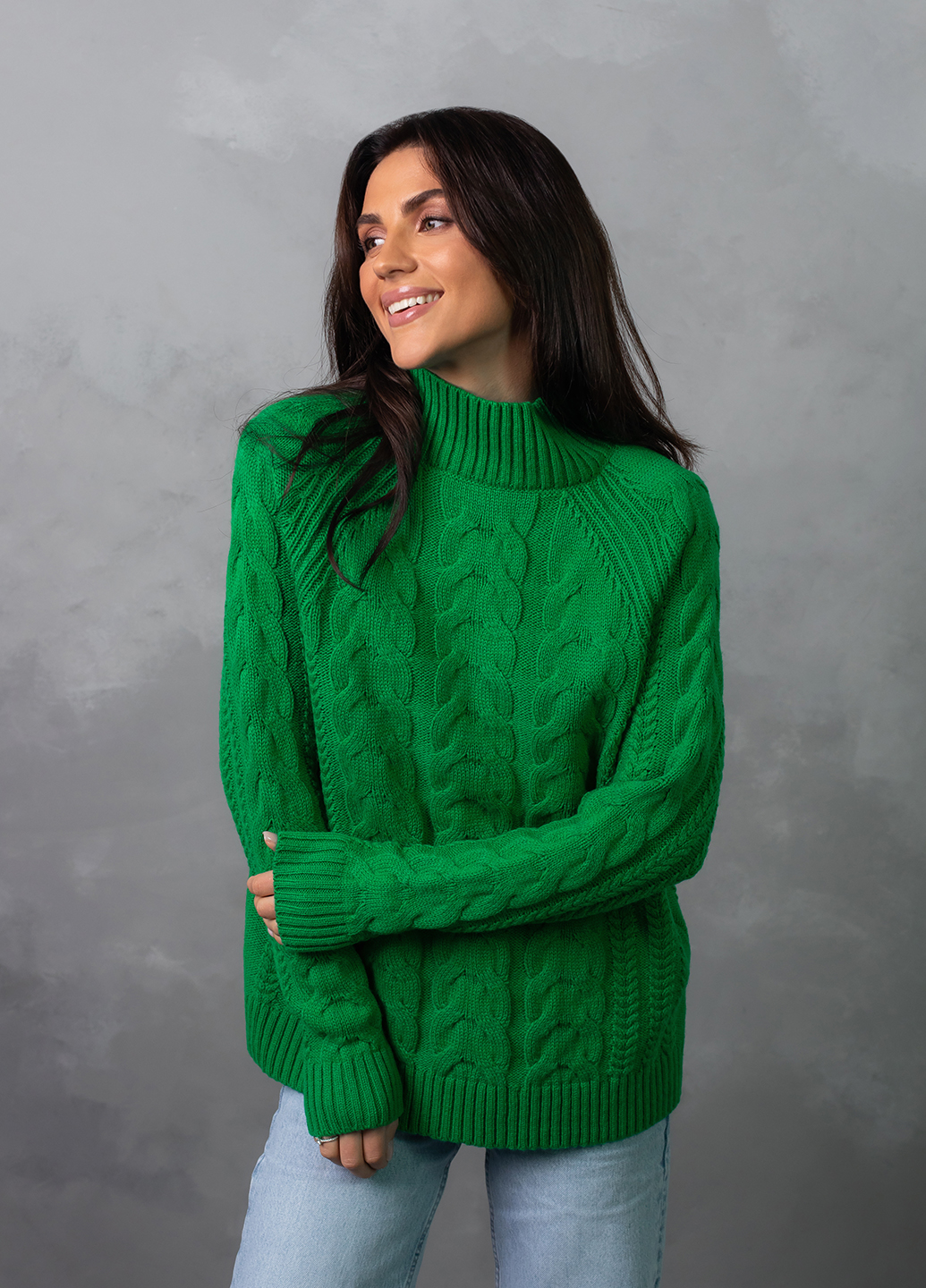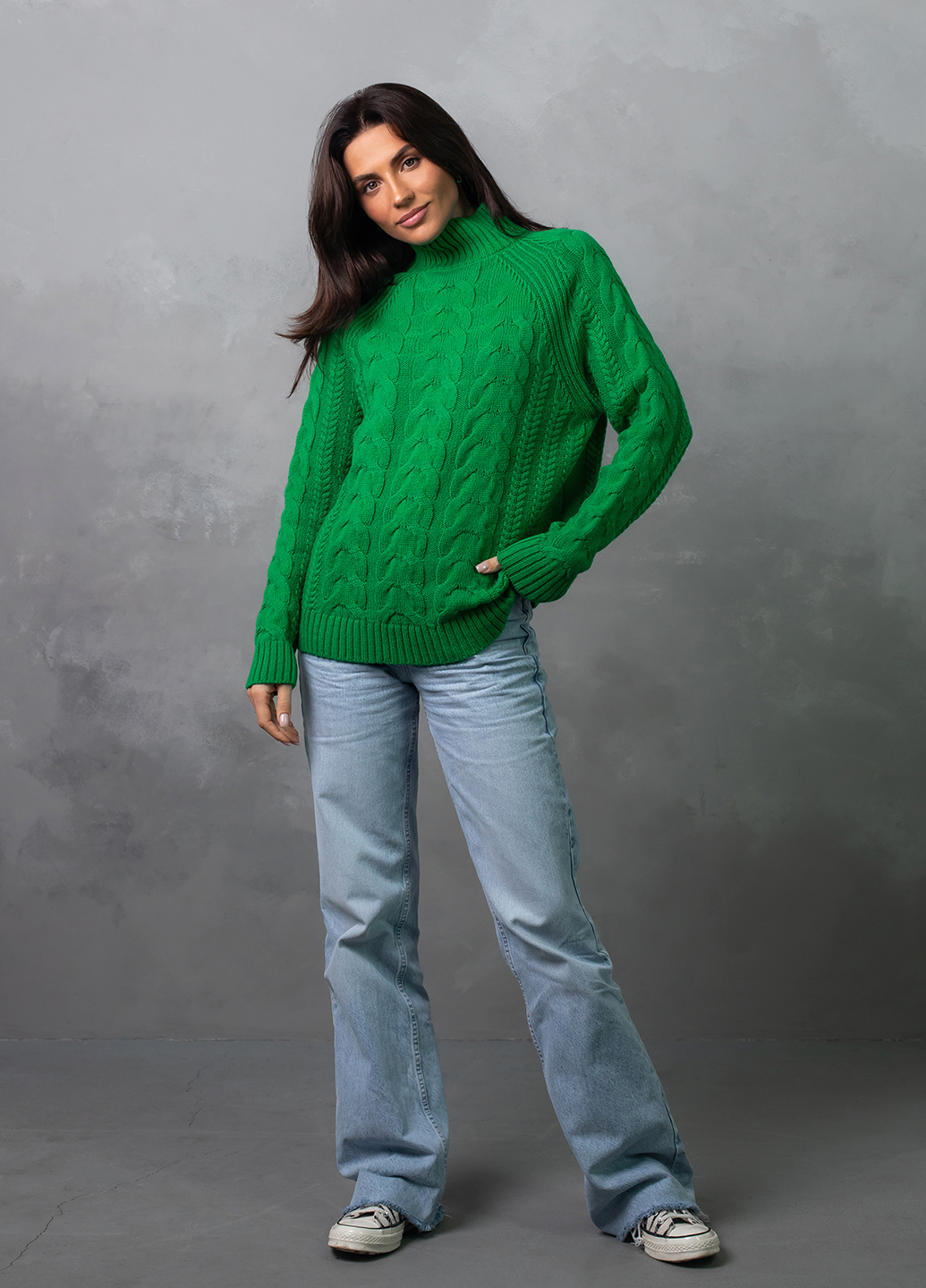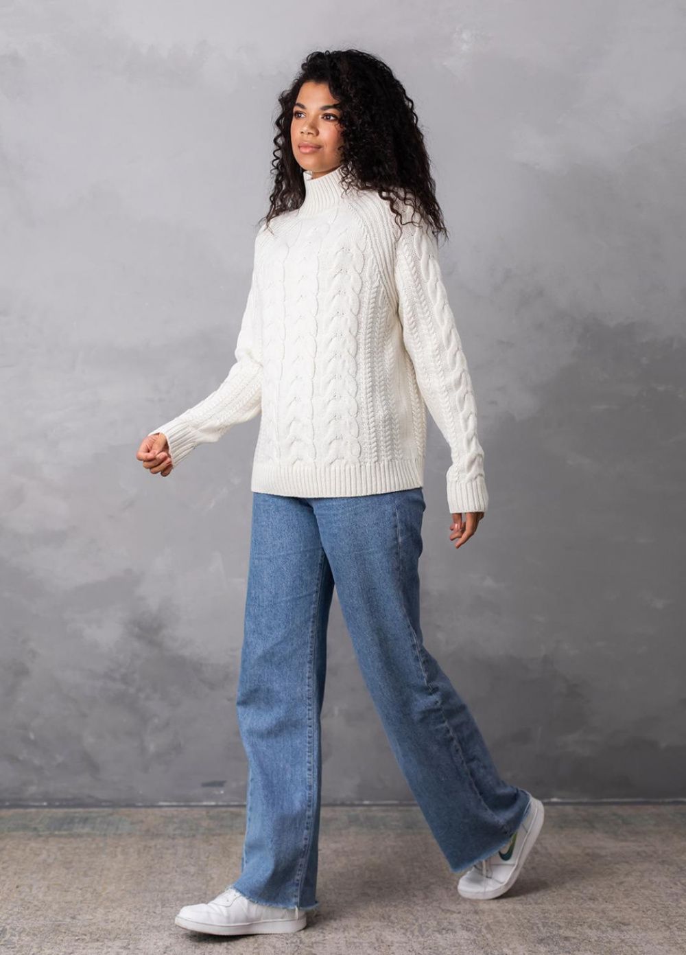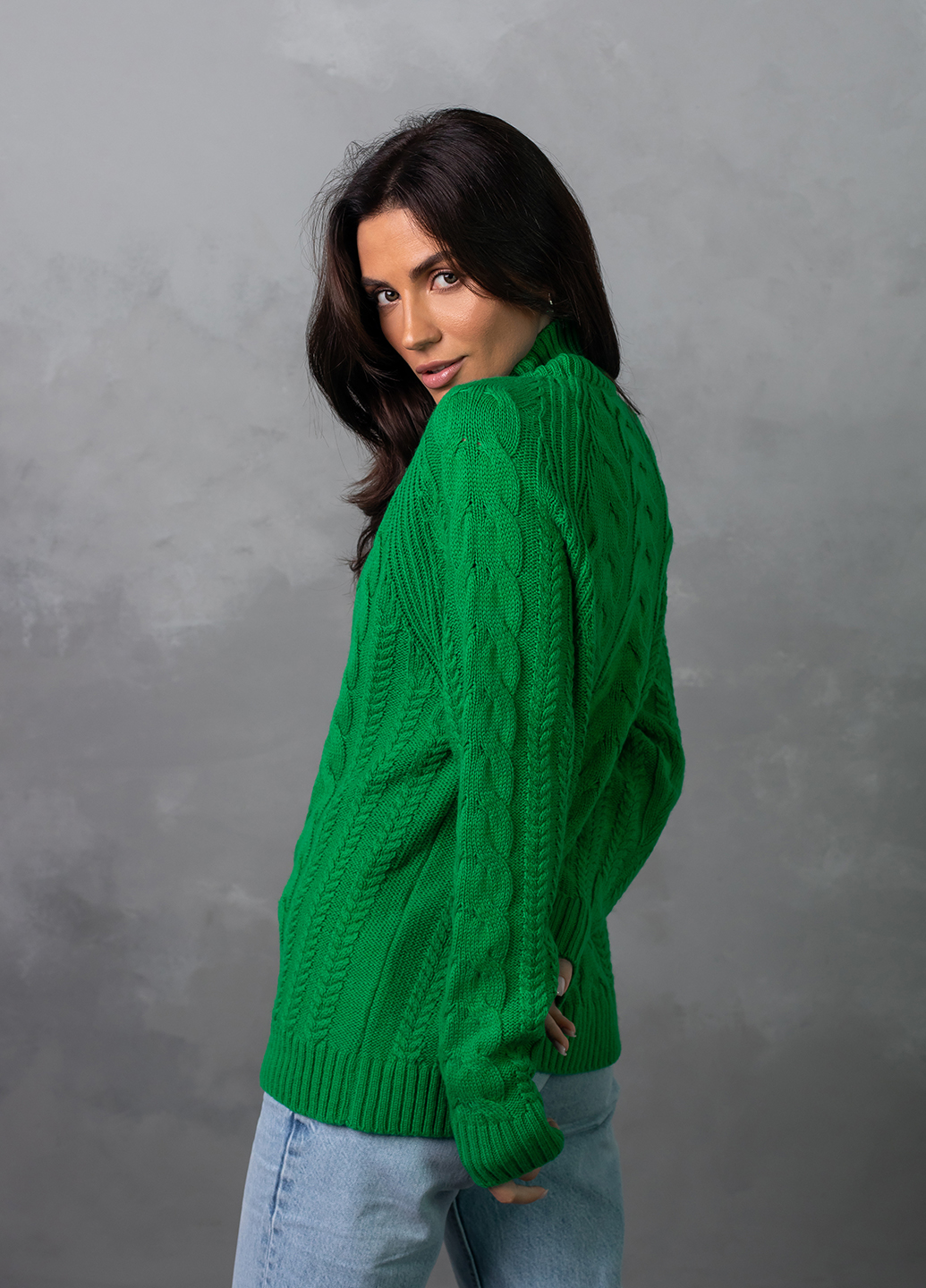 Светр з фактурним об'ємним узором «коси» забезпечує комфорт і дуже приємне відчуття впевненості в холодну погоду. Ця модель виконана з м'якої, легкої та приємної на дотик пряжі, яка добре утримує тепло, а зміст поліакрилових волокон в складі виробу робить догляд за ним більш легким та допомагає зберегти форму і насичений колір светра після прання.