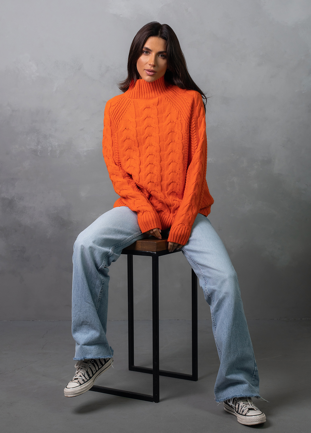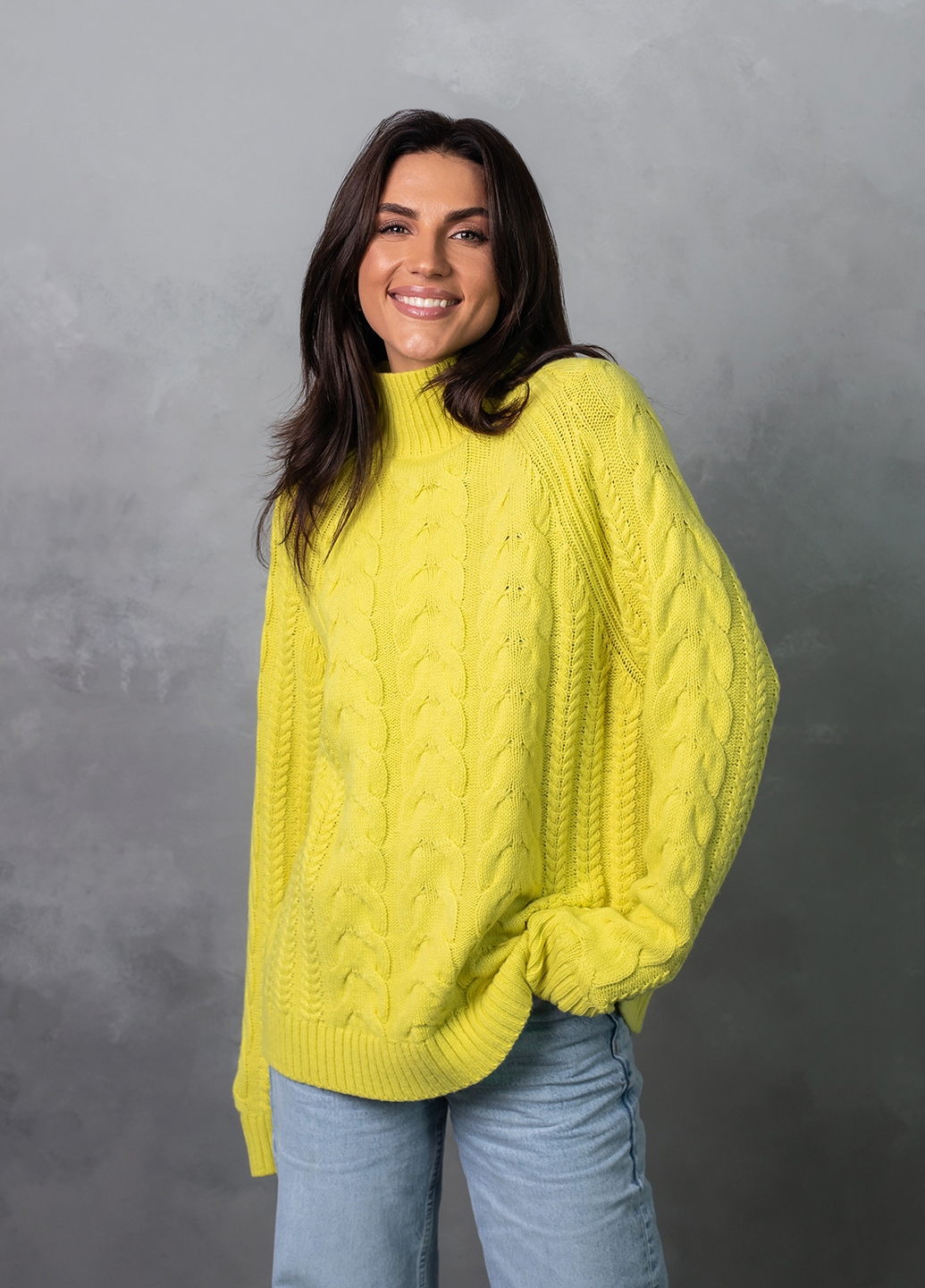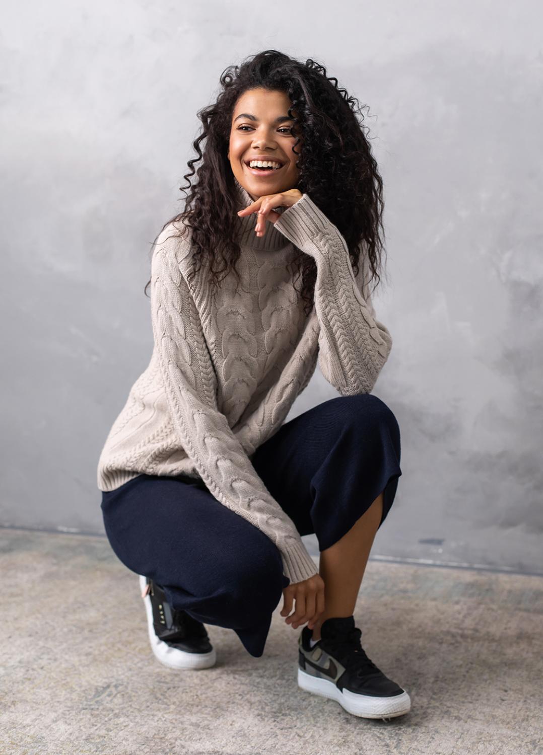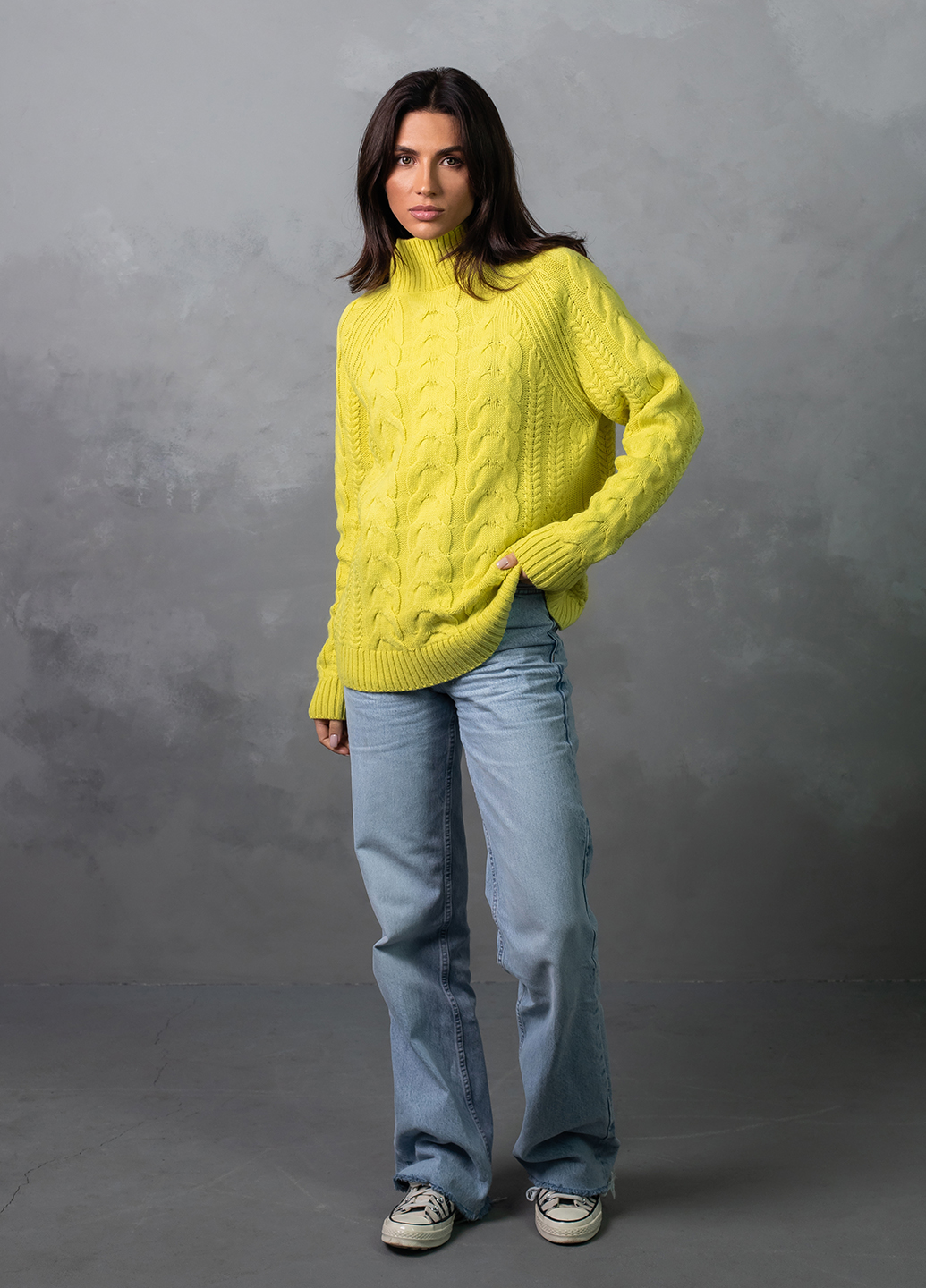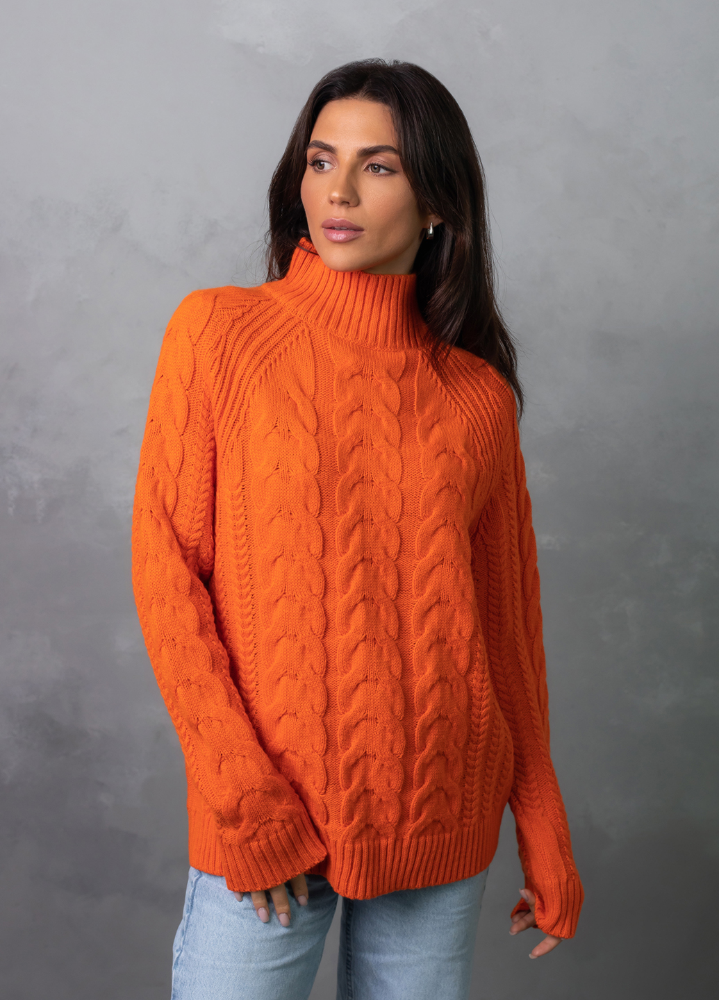 Светр з фактурним об'ємним узором «коси» забезпечує комфорт і дуже приємне відчуття впевненості в холодну погоду. Ця модель виконана з м'якої, легкої та приємної на дотик пряжі, яка добре утримує тепло, а зміст поліакрилових волокон в складі виробу робить догляд за ним більш легким та допомагає зберегти форму і насичений колір светра після прання.