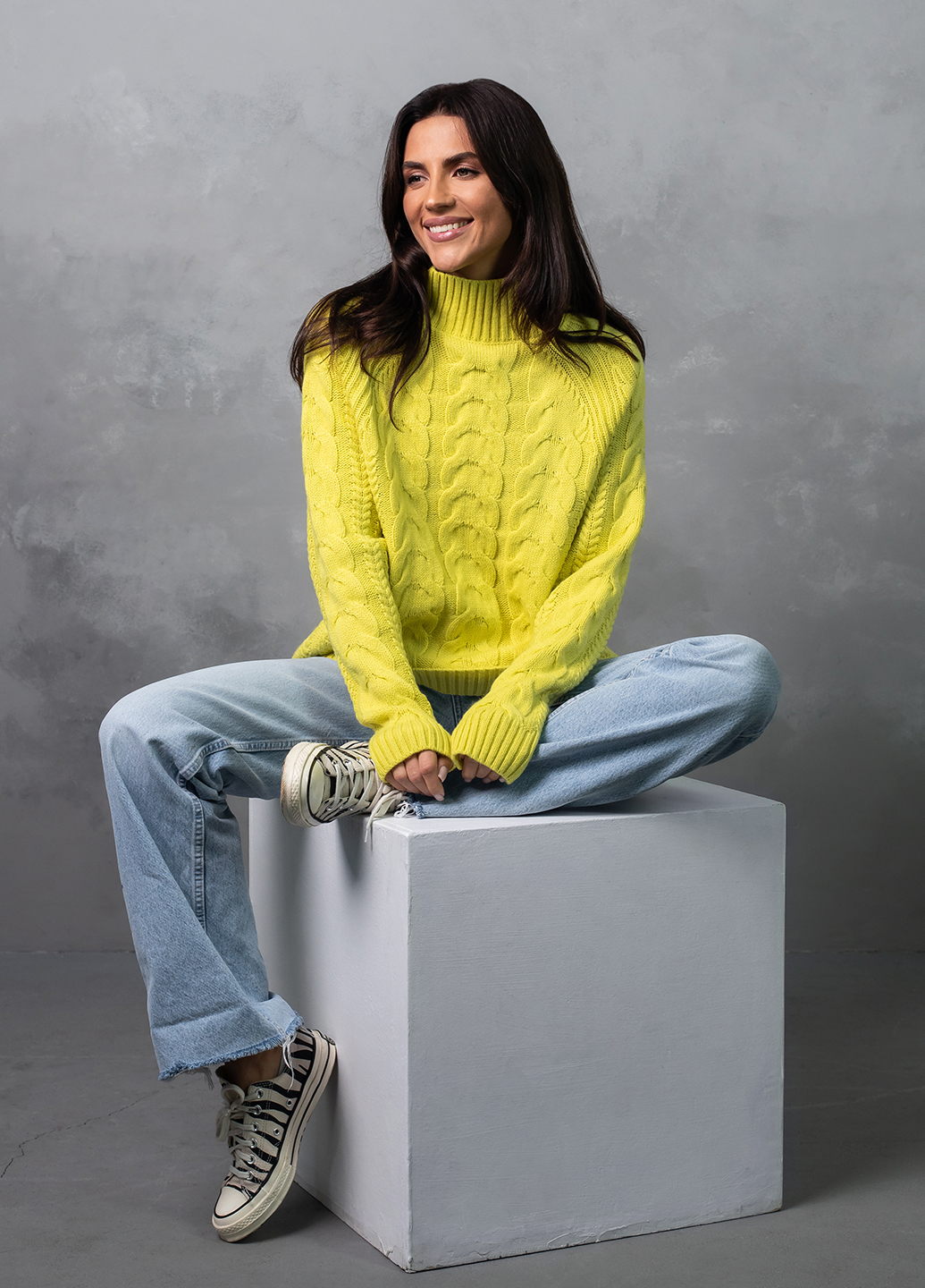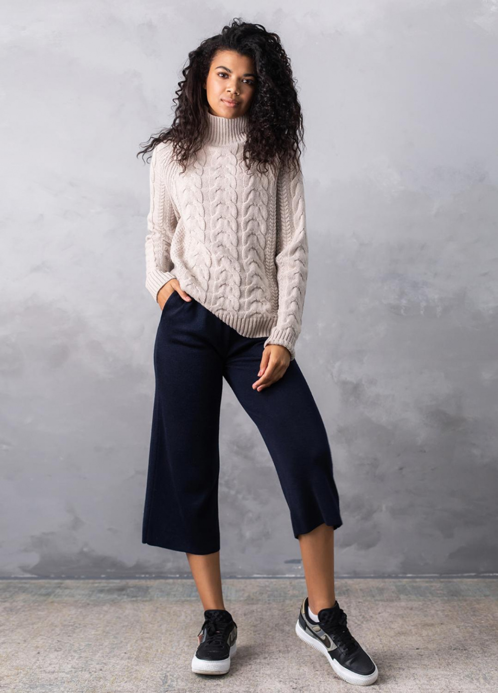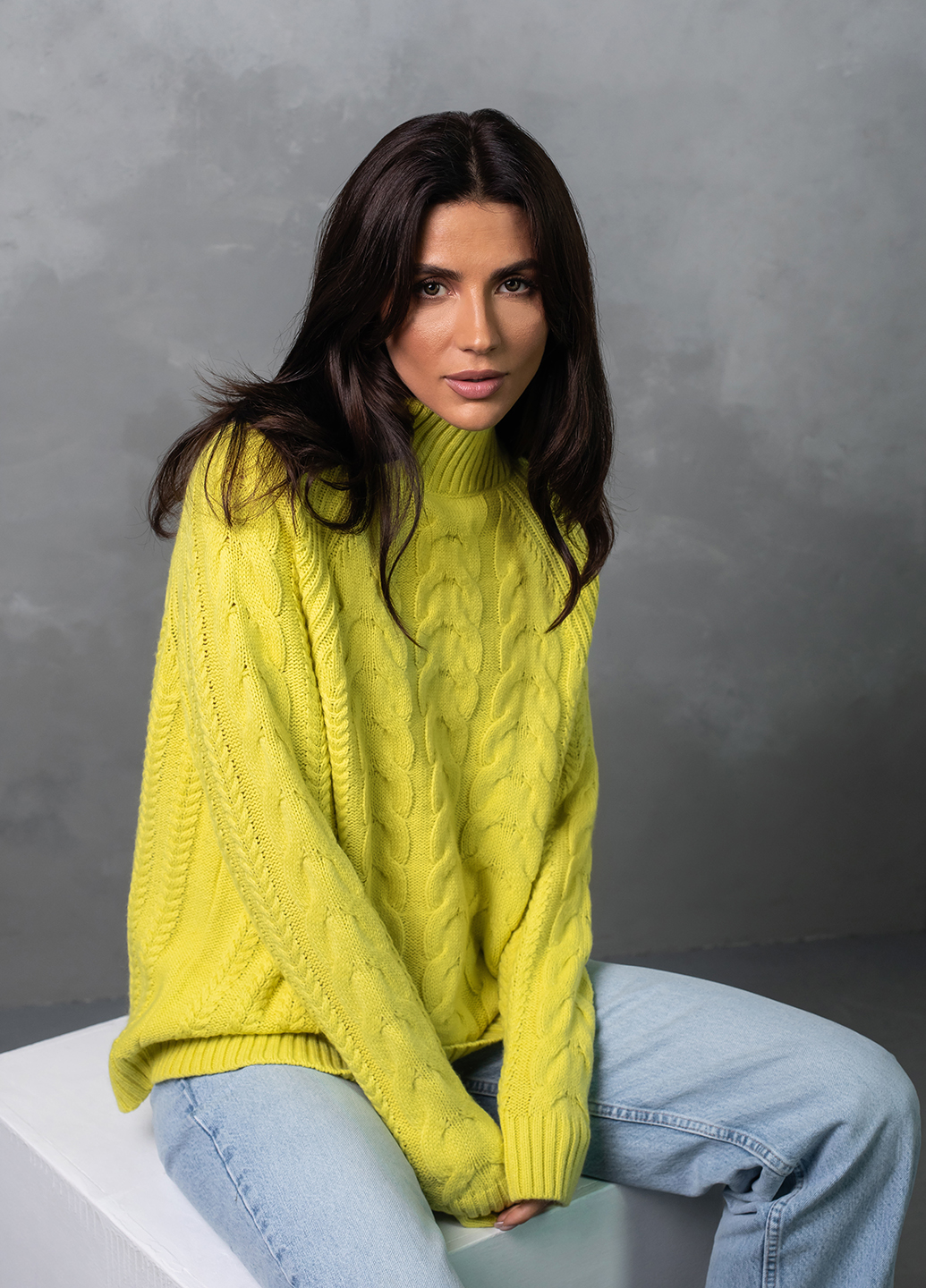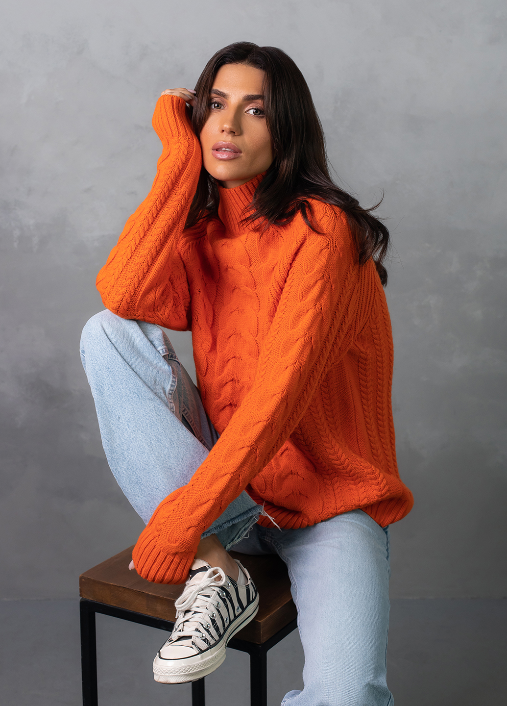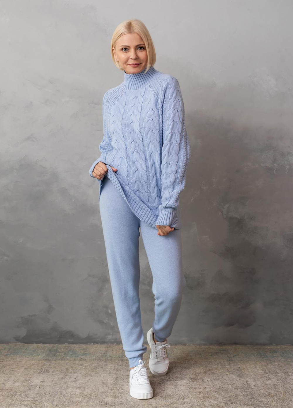 Светр з фактурним об'ємним узором «коси» забезпечує комфорт і дуже приємне відчуття впевненості в холодну погоду. Ця модель виконана з м'якої, легкої та приємної на дотик пряжі, яка добре утримує тепло, а зміст поліакрилових волокон в складі виробу робить догляд за ним більш легким та допомагає зберегти форму і насичений колір светра після прання.