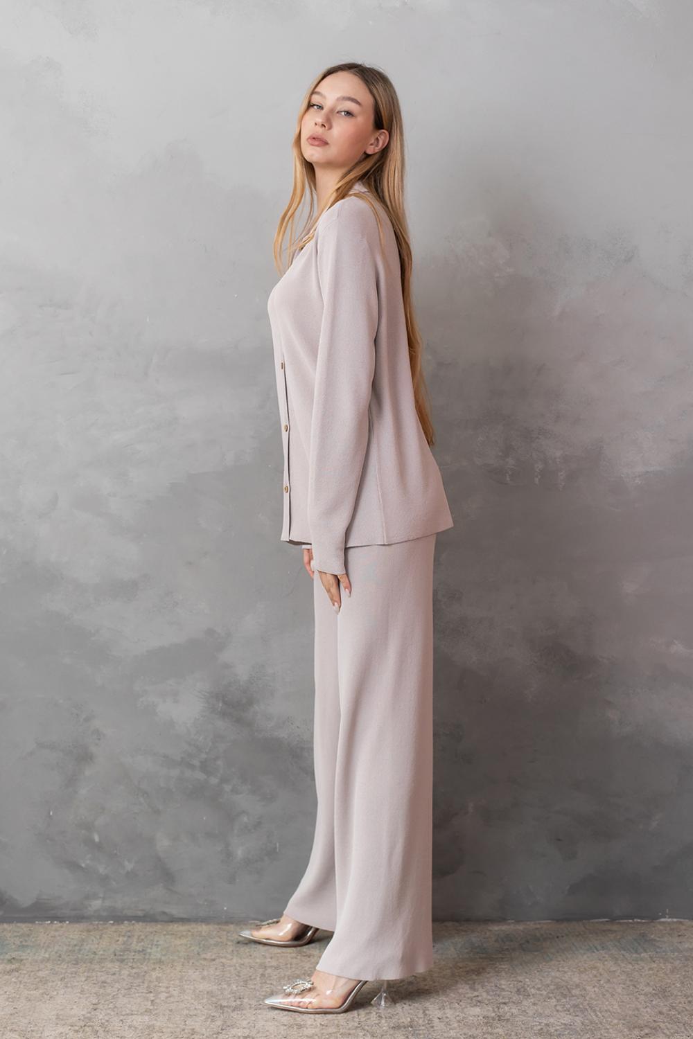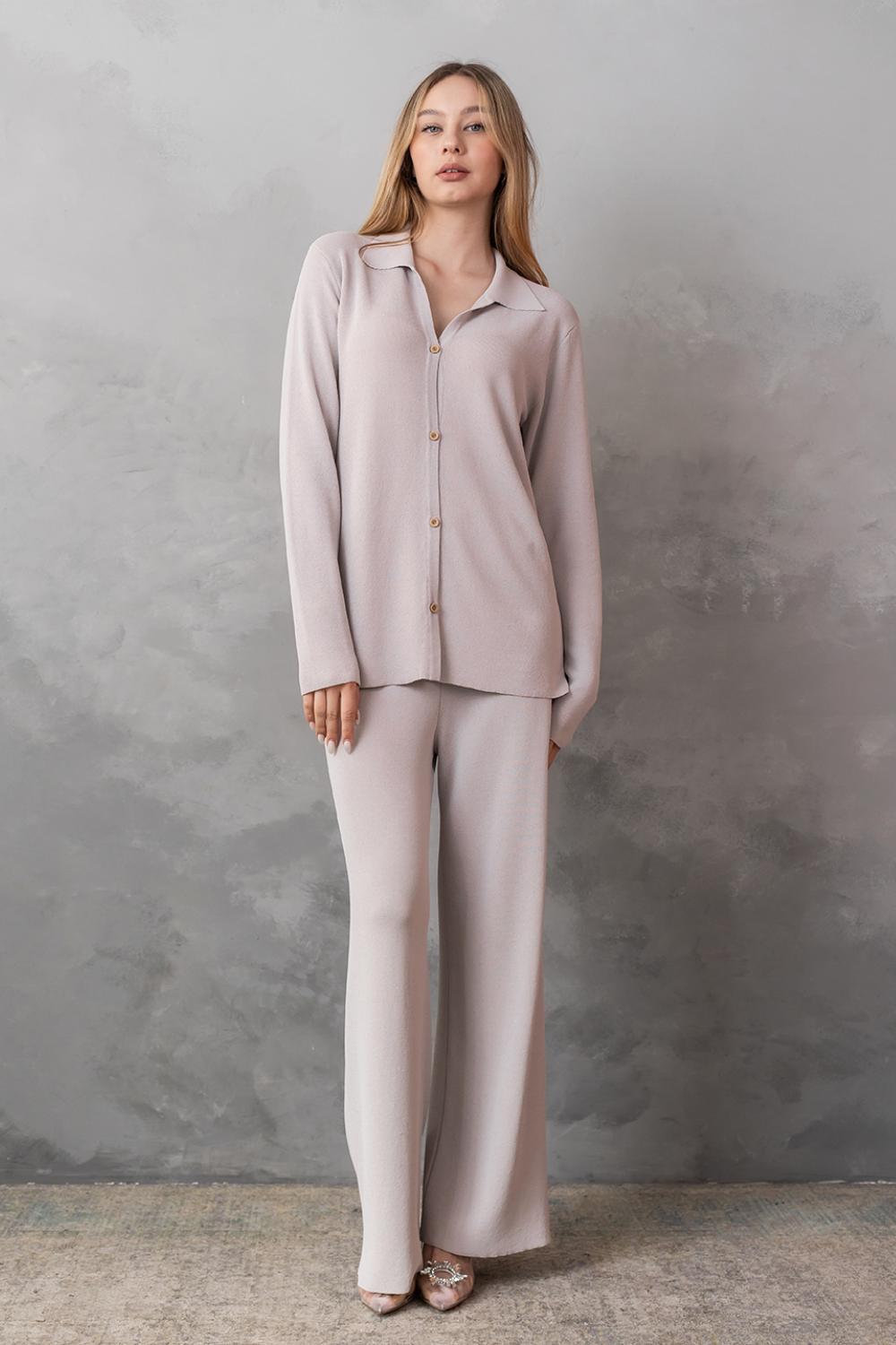 У комплект до штанів можна підібрати кардиган-сорочку такого ж кольору та якості.